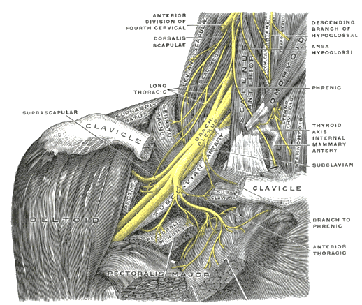 זוהי תמונה שלקוחה מתוך האטלס האנטומי של גריי. בתמונה רואים את שרירי הצוואר (באפור) ואת מערכת העצבים הצפופה והמורכבת שיוצאת מבין חוליות הצוואר (המוסתרות על ידי השרירים), עוברת מתחת לעצם הבריח (clavicle, הנראית מנוסרת כאן למען הדגמת מערכת העצבים) וממשיכה אל מתחת לשרירי הכתף כדי לעצבב את כל שרירי הגפה העליונה מן הכתף ועד קצות האצבעות. מקלעת סבוכה זו של העצבים מכונה "המקלעת הברכיאלית" (Brachial Plexus). באופן כללי צריך לזכור שהעצבים הם שמוליכים בצורת זרם חשמלי את הוראות ההפעלה מן המוח אל השרירים. העברת החשמל אל השרירים גורמת לכיווצם, ותנועת היד יוצאת לפועל. פגיעה באותם "כבלים חשמליים" תביא לפגיעה ביכולת הפעלת השרירים.